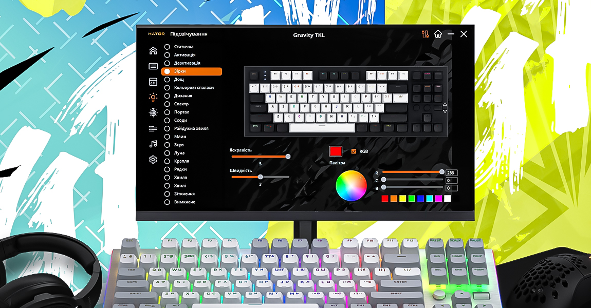 RGB підсвічування з 16.8 мільйонами кольорів, можливістю налаштування кожної клавіші окремо та додатковими бічними зонами.